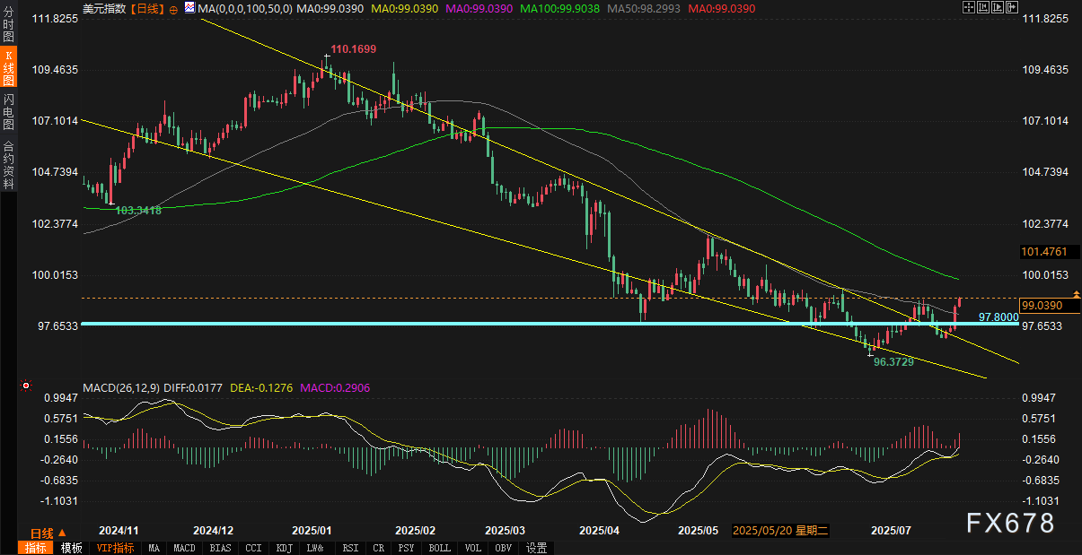 汇通财经APP讯——周二(7月29日)配资网上配资网,美元指数(DXY)延续近期强劲涨势,最新报价徘徊在98.89附近,巩固了周一1%的单日涨幅——这是自5月以来最强的单日表现。受美欧贸易协议框架达成以及市场对美国经济数据和美联储政策的乐观预期推动,美元指数7月以来已累计上涨超2%,有望录得自去年12月以来首次月度上涨。尽管日内稍有回落,美元指数仍守住关键支撑位,市场情绪在贸易乐观情绪和经济数据预期中保持谨慎乐观。本文将从基本面和技术面角度深入分析美元指数的最新动态,并结合市场情绪和关键数据展望未来走势。